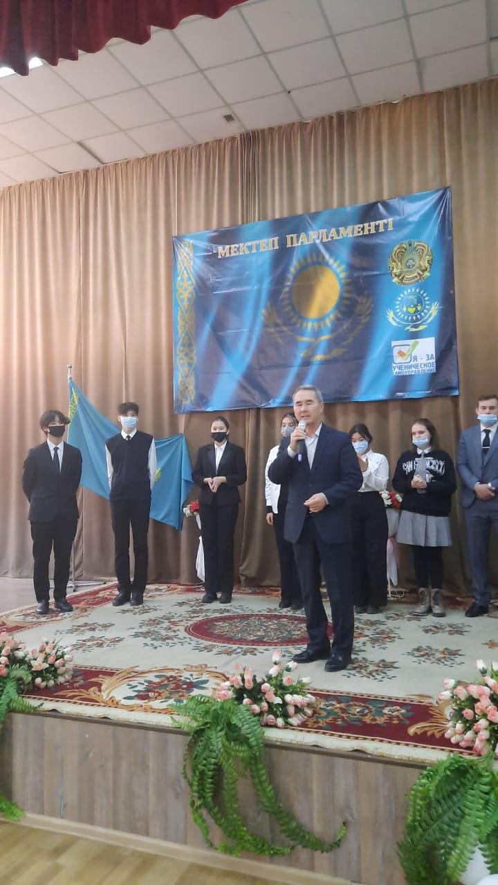 Өтеген батыр ауылы #7 орта мектебінің саптық жиынында мектеп оқушыларының өзін-өзі басқару ұйымының президентін ұлықтау рәсімі өтті.