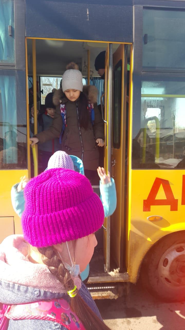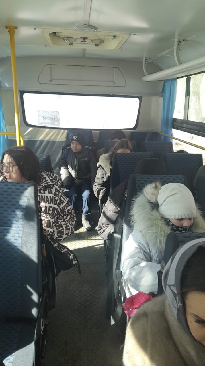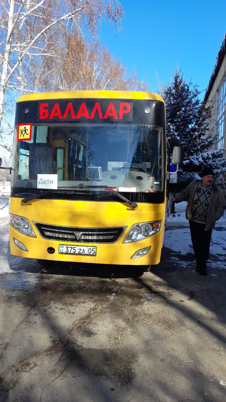 Автобуста талапқа сай «Балалар» деген белгі, жүргізушіде қозғалыс кестесі мен балалардың тізімі бар.