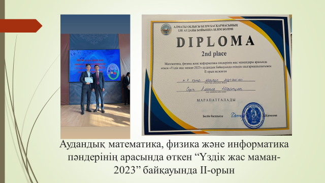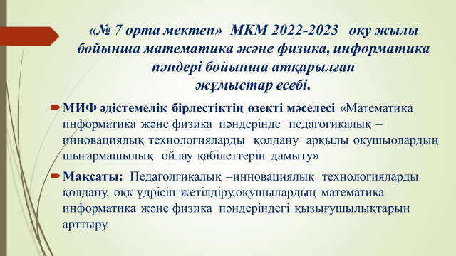10 май 2023 0 1 2 3 4 5 «№ 7 орта мектеп» МКМ 2022-2023 оқу жылы бойынша математика және физика, информатика пәндері бойынша атқарылған жұмыстар есебі.