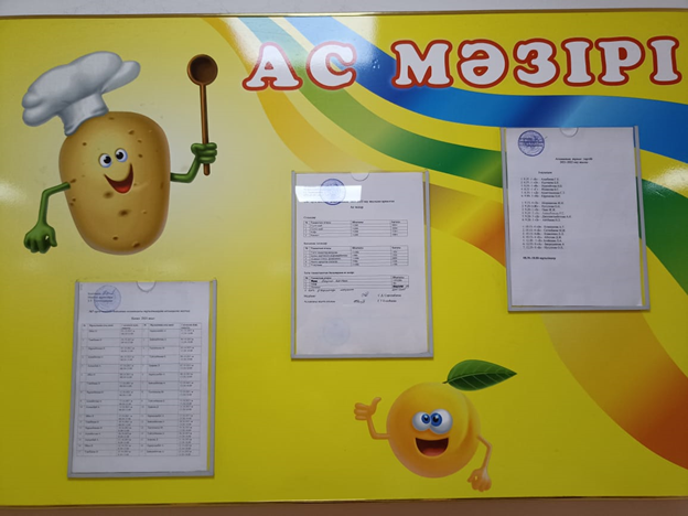 Сонымен қатар тамақтың сапасын анықтап отыру мақсатында бракераждық комиссия құрамы құрылған. Комиссия құрамындағылар айына бір рет асхана тамағының сапасын тексереді және тексеру нәтижесінде акт толтырылады. Айына бір рет тамақтану мен тамақ пісіру орнына тазалық жасалынып, дезинфекцияланып отыру көзделіп, іске асуда. Мектеп асханасында ұсынылатын тағамдар сапасы нормативке сай, ыстық тағамдар түрі күнделікті өзгеріп отырылады. Буфеттік тағамдар түрі жиі толықтырылып тұрады.Тыйым салынған өнімдер сатылмайды.